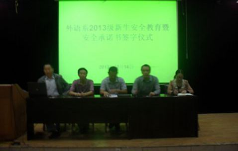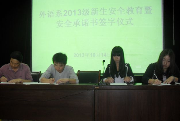 10月14日晚,外語系2013級新生安全教育暨安全承諾書簽字儀式在1號教學(xué)樓六樓報(bào)告廳舉行。學(xué)校保衛(wèi)處副處長(主持工作)張文華、副處長王開忠、外語系黨總支書記李延福、學(xué)工辦主任森龍、新生輔導(dǎo)員常遠(yuǎn)紅及全體新生共200余人參加了安全教育大會,大會由任森龍老師主持。
