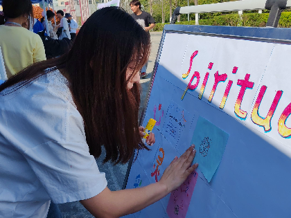 智力挑戰(zhàn)區(qū)則通過(guò)單詞接龍等趣味游戲,著重考驗(yàn)同學(xué)們的詞匯量和反應(yīng)力,充分展現(xiàn)了英語(yǔ)的魅力;在潛能開發(fā)區(qū),同學(xué)們利用肢體動(dòng)作表達(dá)情緒,讓情緒跨越語(yǔ)言的障礙,實(shí)現(xiàn)心與心的交流;朋輩互助區(qū)同樣精彩,同學(xué)們將困惑寫進(jìn)紙條投入“心靈樹洞”,同時(shí)收獲“解藥”,搭建朋輩溝通橋梁,給予彼此溫暖。