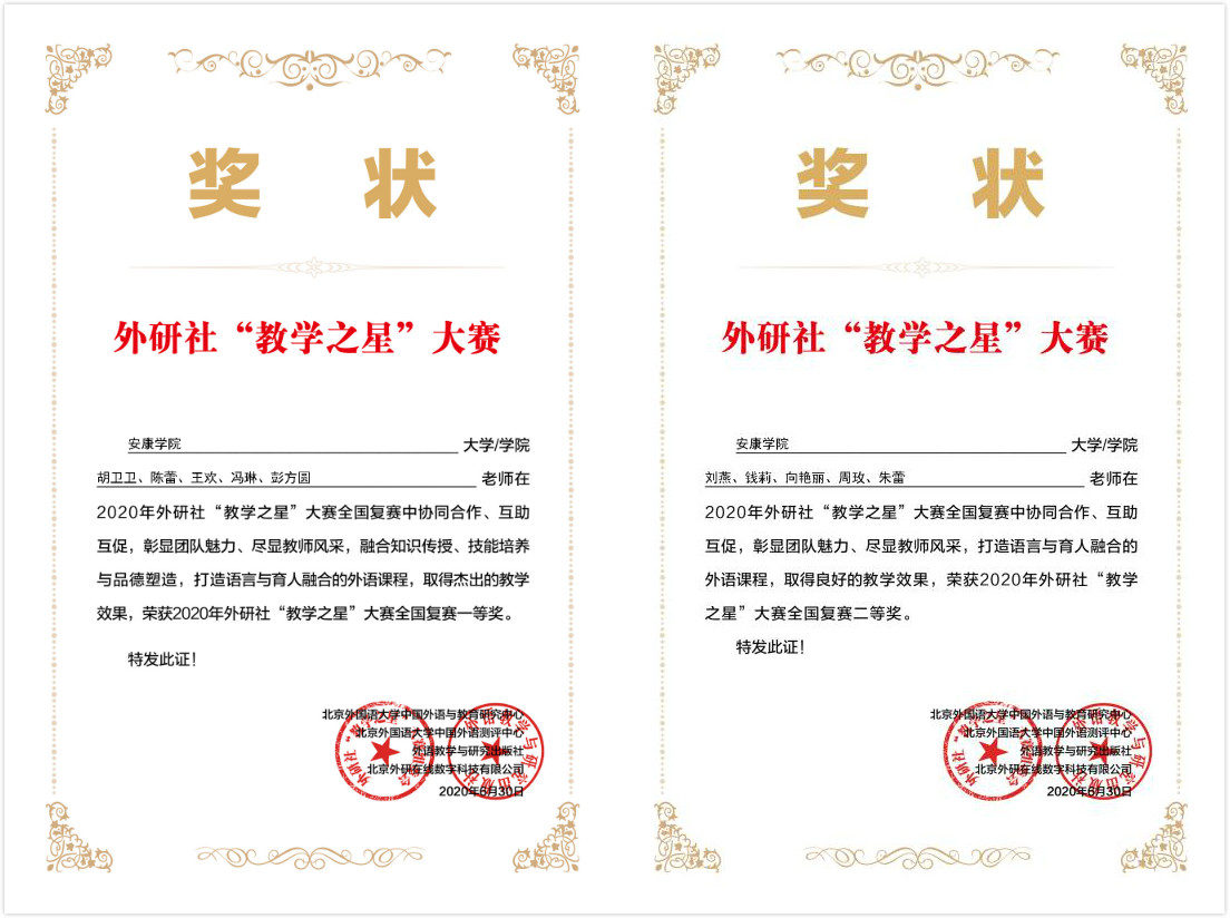 近日,2020年外研社“教學(xué)之星”大賽全國(guó)復(fù)賽成績(jī)揭曉,外語(yǔ)學(xué)院推薦兩個(gè)教學(xué)團(tuán)隊(duì)在全國(guó)四百多所高校的激烈競(jìng)爭(zhēng)中脫穎而出:由副院長(zhǎng)胡衛(wèi)衛(wèi)作為團(tuán)隊(duì)負(fù)責(zé)人的專業(yè)教師教學(xué)團(tuán)隊(duì)(成員:陳蕾、王歡、馮琳、彭方圓)獲得了英語(yǔ)專業(yè)組本科組一等獎(jiǎng),劉燕副教授作為團(tuán)隊(duì)負(fù)責(zé)人的大學(xué)英語(yǔ)教師教學(xué)團(tuán)隊(duì)(成員:錢莉、向艷麗、周玫、朱蕾)獲得了大學(xué)英語(yǔ)組二等獎(jiǎng)的好成績(jī)。