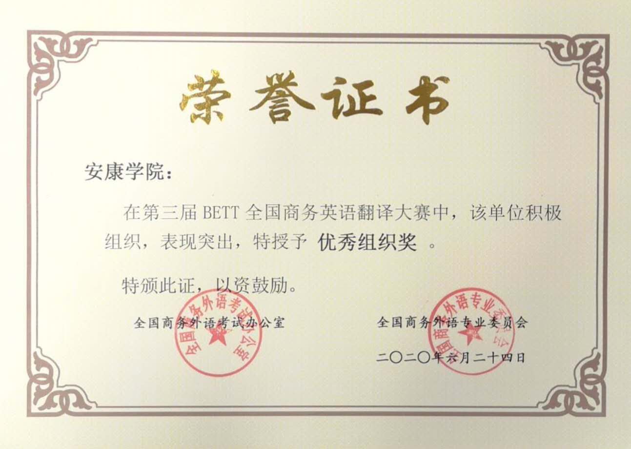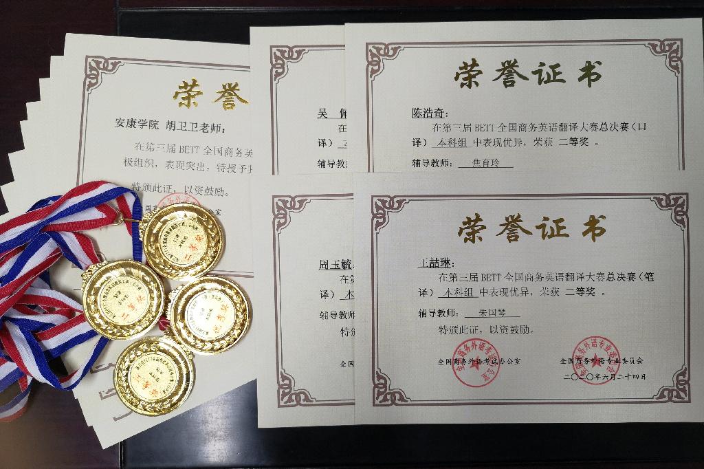 近日,由全國商務(wù)外語考試辦公室和全國商務(wù)外語專業(yè)委員會舉辦的第三屆全國商務(wù)英語翻譯大賽(BETT)發(fā)布總決賽獲獎情況通知,外語學(xué)院學(xué)生陳浩奇獲本科口譯組二等獎,王喆琳、周玉毓和吳佩分獲本科筆譯組二、三等獎和優(yōu)秀獎,并取得全國商務(wù)英語翻譯考試高級證書,這是我院學(xué)生參加此類比賽獲得的歷史最佳成績。同時,外語學(xué)院教師陳蕾、焦育玲、朱國琴、彭方圓獲“優(yōu)秀指導(dǎo)教師”稱號。