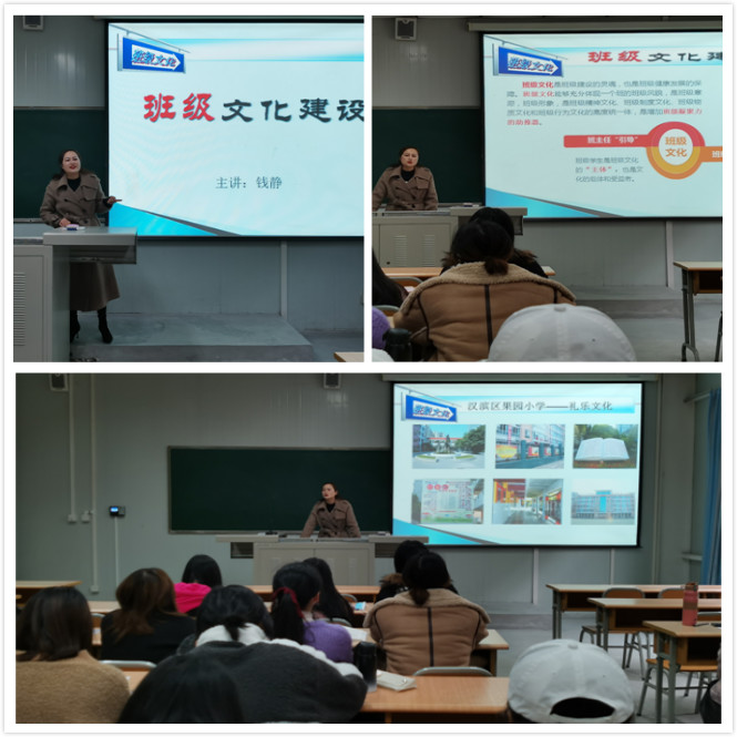 講座中,錢(qián)靜老師主要從班級(jí)文化的構(gòu)建,班級(jí)文化的影響因素以及班級(jí)的制度文化等方面為同學(xué)們做了詳細(xì)講解。錢(qián)老師指出,班級(jí)文化是在班主任引領(lǐng)下在班級(jí)內(nèi)部形成的特有的作風(fēng)和行為準(zhǔn)則,是班級(jí)靈魂的獨(dú)特展現(xiàn)。中小學(xué)班級(jí)文化對(duì)學(xué)生的健康成長(zhǎng)和全面發(fā)展有著重要的影響,是學(xué)生道德品質(zhì)教育的主要渠道,對(duì)形成良好的班風(fēng)具有重要意義。同時(shí),錢(qián)老師還介紹了漢濱區(qū)果園小學(xué)特色文化——禮樂(lè)文化等。