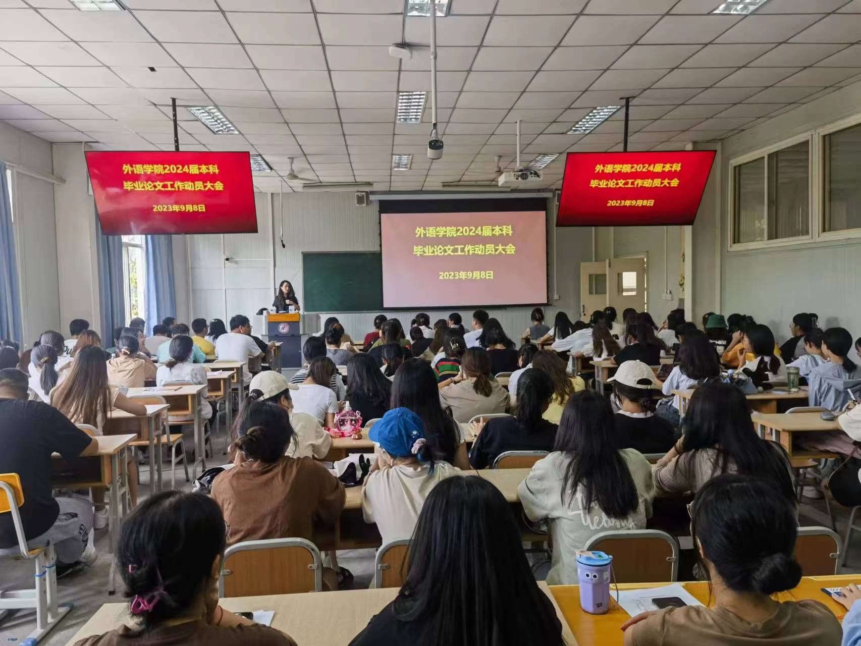為確保畢業(yè)論文工作順利進(jìn)行,外語學(xué)院于2023年9月8日下午,分別召開了2024屆畢業(yè)論文工作教師動員大會及學(xué)生動員大會。會議由副院長胡衛(wèi)衛(wèi)主持,外語學(xué)院黨總支書記肖紅香、副院長劉子富、所有畢業(yè)論文指導(dǎo)教師及2020級本科、2022級專升本所有學(xué)生參加了會議。