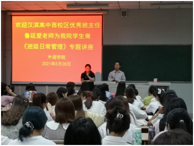 此次講座是2021年度外語(yǔ)學(xué)院加強(qiáng)課程思政示范課和雙師課程建設(shè)的重要舉措,旨在通過(guò)校內(nèi)外師資共同體打造一流課程,培養(yǎng)合格中學(xué)英語(yǔ)教師。本次活動(dòng)將進(jìn)一步加深我院師范生對(duì)教師職業(yè)尤其是班主任崗位角色、意義、工作內(nèi)容和方法的認(rèn)識(shí),提高師范生愿做、能做、會(huì)做班主任工作的能力,為師范生未來(lái)教師職業(yè)發(fā)展奠定必要的基礎(chǔ)。