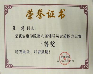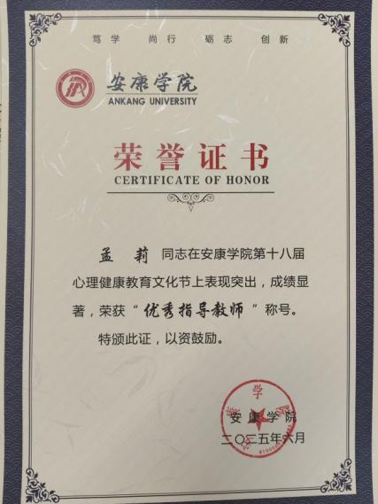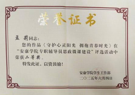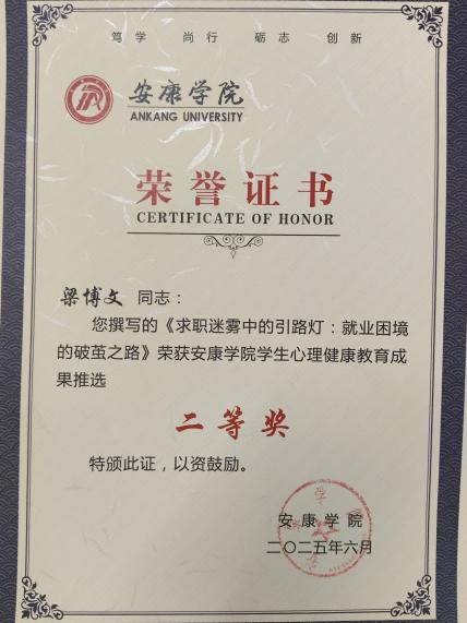 在安康學院第十八屆大學生心理健康教育文化節(jié)系列活動中,梁博文立足學生就業(yè)心理輔導實踐,撰寫的案例《求職迷霧中的引路燈:就業(yè)困境的破繭之路》以對學生心理問題的精準剖析和科學有效的干預策略,榮獲學生心理健康教育成果二等獎;孟莉在心理健康文化節(jié)活動組織與學生指導中表現(xiàn)突出,榮獲“優(yōu)秀指導教師”稱號。在安康學院專職輔導員思政微課建設評選活動中,孟莉的作品《守護心靈陽光 擁抱青春時光》以生動案例與情感共鳴,引導學生關注心理健康,榮獲二等獎;劉思晨的作品《從大學生活說職業(yè)規(guī)劃》,緊密結(jié)合大學生成長實際,深入淺出解析職業(yè)規(guī)劃要點,榮獲三等獎。在安康學院第八屆輔導員素質(zhì)能力大賽中,孟莉憑借扎實的理論功底榮獲三等獎。此外,黃梓軒在征兵工作中表現(xiàn)優(yōu)異,榮獲“先進個人”稱號。