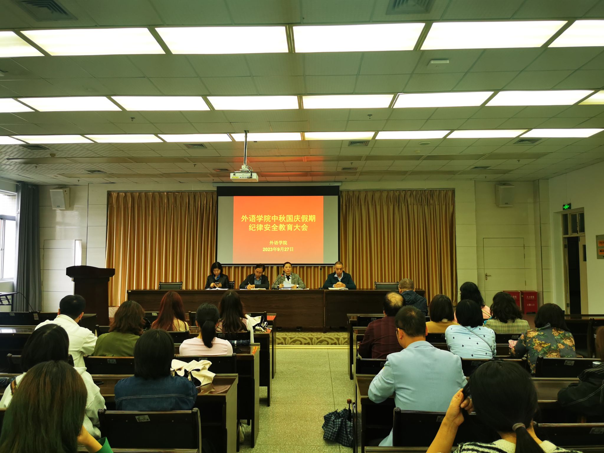 為提高安全防范意識(shí),保障師生生命財(cái)產(chǎn)安全,度過(guò)安寧祥和的中秋國(guó)慶假期,9月27日下午,外語(yǔ)學(xué)院在圖書館報(bào)告廳召開(kāi)了中秋國(guó)慶假期紀(jì)律安全教育大會(huì)。外語(yǔ)學(xué)院全體教職工、各班班長(zhǎng)、團(tuán)支書及2023級(jí)新生參加了大會(huì)。大會(huì)由黨總支書記肖紅香主持。