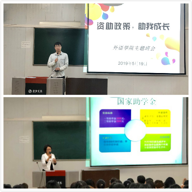 首先由梁博文老師致辭并介紹會議流程,隨后輔導員常遠紅用PPT輔助介紹了國家對經濟困難學生的資助政策,從資助范圍、資助標準、申請條件、申請時間、發(fā)放時間等方面進行了詳細地講解。常老師還詳細介紹了國家獎學金和國家勵志獎學金的申請標準、評審及發(fā)放相關程序,并系統地講述了生源地信用助學貸款及還款流程及征信政策, 引導學生了解資助政策,認識誠信貸款、誠信做人的重大意義;接下來優(yōu)秀學生代表—國家勵志獎學金獲得者鄭丹和同學們分享了自己的勵志成長歷程,使同學們深刻感受到,出身貧困不可畏,勵志奮斗可成功。
