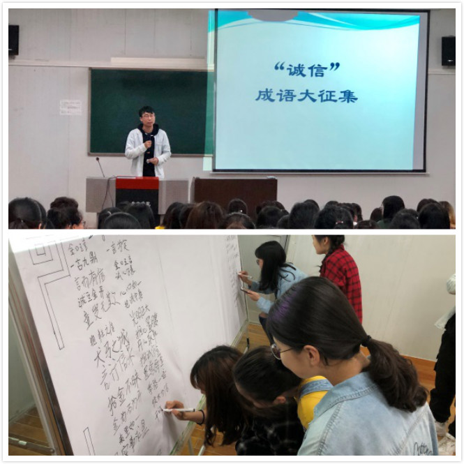 到了“誠信”成語大征集的環(huán)節(jié),同學們爭先恐后地在征集板上寫下自己所了解的誠信成語,英語格言,并講述了成語的出處和典故。一個個成語背后的誠信故事,潛移默化地熏陶著學生的思想,引導著學生對誠信的感知,加深著學生對誠信的理解。