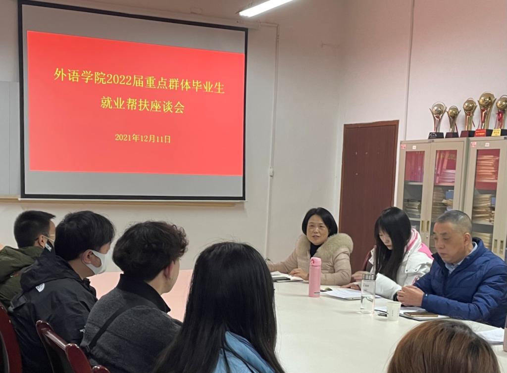 為進(jìn)一步貫徹落實(shí)國(guó)家對(duì)重點(diǎn)群體畢業(yè)生的就業(yè)幫扶政策,確保重點(diǎn)群體畢業(yè)生充分就業(yè),外語(yǔ)學(xué)院于2021年12月11日上午召開了2022屆重點(diǎn)群體畢業(yè)生就業(yè)精準(zhǔn)幫扶座談會(huì)。外語(yǔ)學(xué)院副院長(zhǎng)劉子富,幫扶教師姜國(guó)波、高亮、梁藝凡、陳玉平、畢業(yè)班輔導(dǎo)員常遠(yuǎn)紅、李夢(mèng)和2022屆重點(diǎn)群體畢業(yè)生25名同學(xué)參加了座談會(huì)。