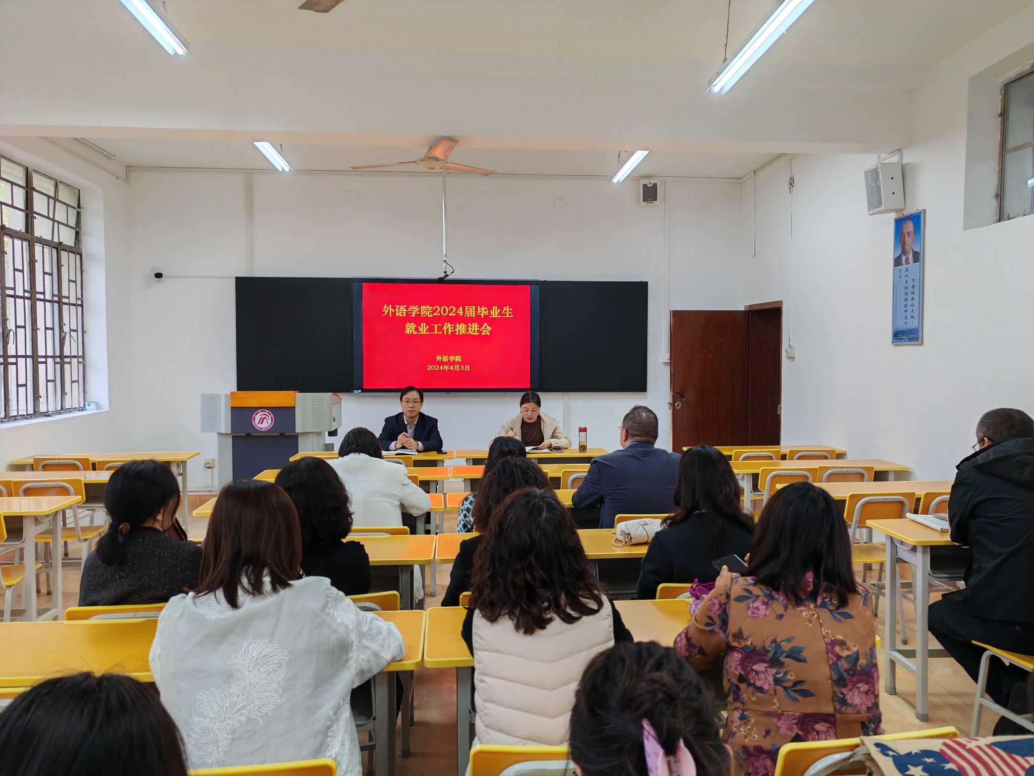 近日,外語學院聚焦人才培養(yǎng)目標,認真貫徹落實認真貫徹落實習近平總書記關于就業(yè)工作的重要指示批示精神及學校就業(yè)創(chuàng)業(yè)工作會議精神,通過專題會議、訪企拓崗、考研指導、海外留學宣講、專場招聘、用人單位座談等系列活動,助力畢業(yè)生實現(xiàn)高質量充分就業(yè)。召開專題會議,做好安排部署。4月3日下午,外語學院召開2024屆畢業(yè)生就業(yè)工作推進會。會議傳達了學校副校長屈險峰一行來院調研指導就業(yè)工作情況,通報了近三年學院各專業(yè)就業(yè)情況及2024屆畢業(yè)生的基本情況及當前就業(yè)工作進展情況,就存在的困難和問題進行了說明,安排部署了推進2024屆畢業(yè)生就業(yè)工作的措施和方法。營造了領導重視、全體黨員、全院教職工共同關注學生發(fā)展,用心用情用力幫助學生實現(xiàn)高質量充分就業(yè)的良好氛圍。