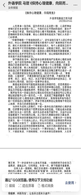 為進(jìn)一步加強(qiáng)心理健康教育,宣傳心理健康的知識(shí),我院開展“心相遇 愛同行—心理健康教育伴我成長”征文比賽活動(dòng)。此次活動(dòng)旨在提倡大學(xué)生關(guān)注心理健康,倡導(dǎo)積極的心態(tài)和生活方式,引導(dǎo)同學(xué)們樹立正確的心理觀念。活動(dòng)得到了廣大同學(xué)的積極響應(yīng)和參與。