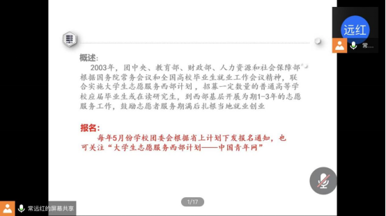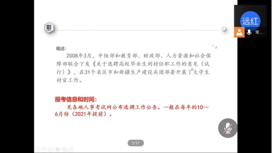 其次,常遠(yuǎn)紅給畢業(yè)生詳細(xì)梳理了國家基層就業(yè)項(xiàng)目,例如特崗教師、選調(diào)村官、西部計(jì)劃、和三支一扶等特殊政策。提醒有意向的學(xué)生及時(shí)關(guān)注各教育廳、市、縣的教育局網(wǎng)站,同時(shí)關(guān)注各地人事考試網(wǎng)和各級政府門戶網(wǎng)站的通知公告。在對國家專項(xiàng)就業(yè)項(xiàng)目的介紹中,常老師重點(diǎn)介紹了國考、省考、選調(diào)生和應(yīng)征入伍的時(shí)間,政策,并就高等院校研究生院的退伍大學(xué)生專項(xiàng)招生計(jì)劃進(jìn)行了詳細(xì)介紹,對高校畢業(yè)生自主創(chuàng)業(yè)的國家政策支持展開了全面的講解。