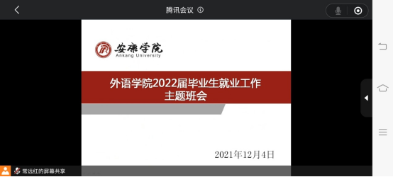 為使應(yīng)屆畢業(yè)生深入了解當(dāng)前的就業(yè)形勢,增加對國家就業(yè)政策與就業(yè)形勢的正確認(rèn)識,外語學(xué)院于2021年12月4日晚上八點(diǎn),通過騰訊會議召開了就業(yè)工作主題班會。此次會議由2018級輔導(dǎo)員常遠(yuǎn)紅老師進(jìn)行主持,2022屆全體畢業(yè)生參加了本次會議。