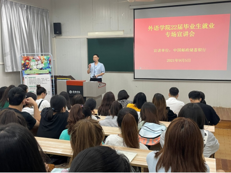 為促進畢業(yè)生就業(yè),搭建畢業(yè)生與用人單位的交流平臺,9月5日晚,外語學(xué)院舉辦了中國郵政儲蓄銀行專場校園招聘宣講會。中國郵政儲蓄銀行安康分行公司人力資源部干事王華磊等受邀來我院為畢業(yè)生做宣講。外語學(xué)院黨總支書記肖紅香,輔導(dǎo)員常遠紅以及2022屆180名畢業(yè)生參加了此次宣講會,會議由輔導(dǎo)員常遠紅主持。