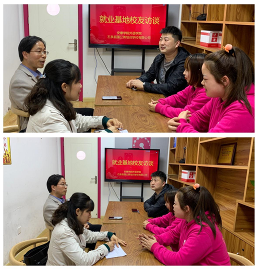 為持續(xù)了解外語學院畢業(yè)生的從業(yè)情況,檢驗人才培養(yǎng)質(zhì)量,完善人才培養(yǎng)方案,切實培養(yǎng)面向地方基礎教育改革和發(fā)展需求的應用型外語人才,近日,外語學院副院長(主持工作)張哲華帶領英語系主任周玫前往石泉蒲公英培訓學校,訪談了我校2016屆畢業(yè)生何紅豆和2020屆畢業(yè)生張媛媛。