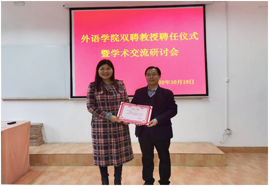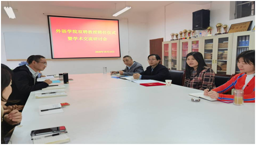 10月19日下午,外語學院在6109舉行了雙聘教授聘任儀式暨學術(shù)交流研討會,陜西師范大學外國語學院李艷教授受聘為我院雙聘教授,并同我院教師進行學術(shù)交流與對話。會議由副院長張哲華主持,學院領(lǐng)導班子、學科團隊教師及部分行政人員參加了本次會議。