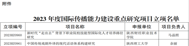 近日,陜西省社科聯(lián)公布了陜西省2023年度國(guó)際傳播能力建設(shè)重點(diǎn)研究項(xiàng)目立項(xiàng)名單,我院副院長(zhǎng)劉子富主持的“大學(xué)外語(yǔ)教育教學(xué)中的課程思政研究”、周純漪教授主持的“‘一帶一路’背景下高校商務(wù)英語(yǔ)國(guó)際化人才培養(yǎng)模式研究”等2項(xiàng)課題獲準(zhǔn)立項(xiàng)。