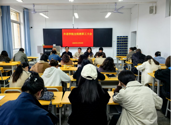 為進(jìn)一步提升學(xué)院教師的思想政治素質(zhì)和職業(yè)道德水平,大力弘揚(yáng)教育家精神,10月22日下午,外語(yǔ)學(xué)院在6206教室召開學(xué)習(xí)習(xí)近平總書記給全國(guó)特崗教師代表重要回信精神專題學(xué)習(xí)會(huì)。學(xué)院全體黨員、全院教職工參加了學(xué)習(xí)會(huì),會(huì)議由外語(yǔ)學(xué)院黨總支書記肖紅香主持。