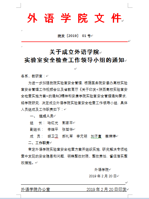 為進(jìn)一步做好實(shí)驗(yàn)室安全管理工作,不斷健全實(shí)驗(yàn)室安全監(jiān)管責(zé)任體系和長(zhǎng)效工作機(jī)制,構(gòu)建和諧、平安校園,經(jīng)研究,外語(yǔ)學(xué)院成立了實(shí)驗(yàn)室安全工作領(lǐng)導(dǎo)小組,并明確了工作職責(zé)。