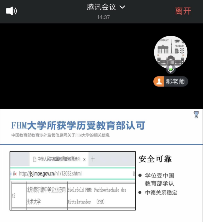 FHM校方分別從學(xué)校環(huán)境、學(xué)科建設(shè)、辦學(xué)條件、學(xué)費(fèi)標(biāo)準(zhǔn)及申請(qǐng)流程等方面為我校學(xué)生進(jìn)行了全面介紹, 從中德高等教育體系的區(qū)別、兩國關(guān)系及留學(xué)背景淵源等引入展開介紹了ITTM項(xiàng)目的人才培養(yǎng)模式、課程設(shè)置等內(nèi)容,并就學(xué)生申請(qǐng)留學(xué)后的就業(yè)、留學(xué)歸國待遇、創(chuàng)新創(chuàng)業(yè)途徑等多方面多角度做了詳細(xì)的留學(xué)規(guī)劃。 會(huì)上,參會(huì)師生和校方代表還就申請(qǐng)途徑、準(zhǔn)備材料、語言水平等相關(guān)問題進(jìn)行了在線討論答疑。