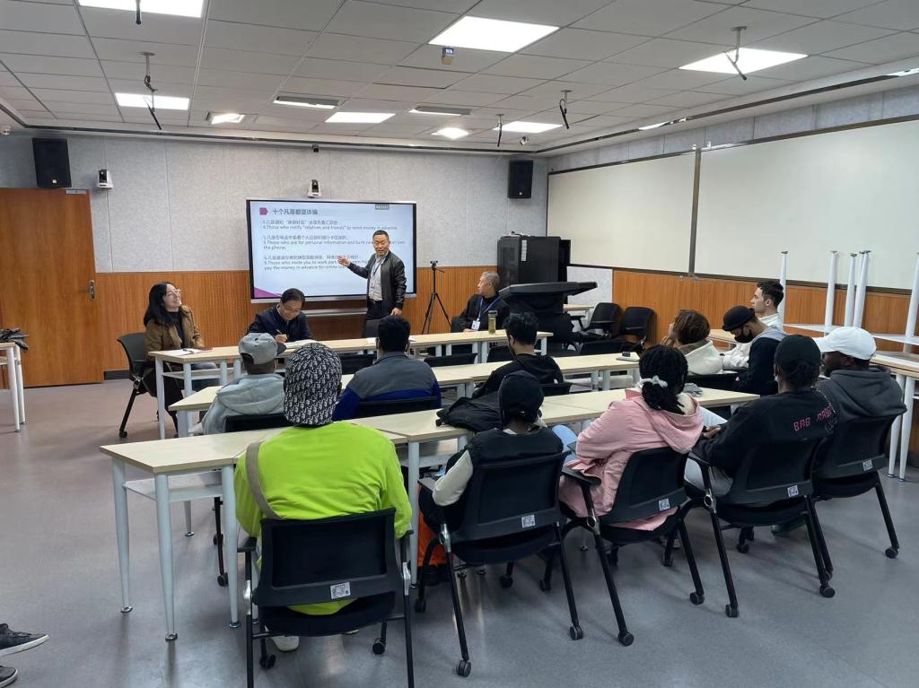張哲華做總結(jié)講話。他號召全體留學(xué)生要主動下載國家反詐中心客戶端,學(xué)習(xí)防范、反詐知識,提高防范意識;要主動學(xué)習(xí)、嚴(yán)格遵守校紀(jì)校規(guī)、法律法規(guī),遵守疫情防控管理規(guī)定;要認(rèn)真學(xué)習(xí)領(lǐng)會中華文化,講好中國故事,做好兩國文化交流的使者。