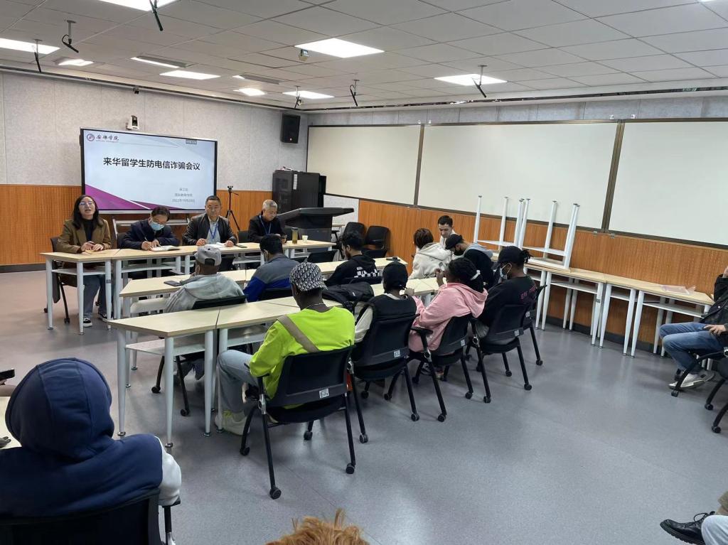 為深入貫徹落實習(xí)近平總書記對打擊治理電信網(wǎng)絡(luò)詐騙犯罪工作的指示精神,進一步提升我校留學(xué)生防范“電信網(wǎng)絡(luò)詐騙”意識和能力,遏制“電信網(wǎng)絡(luò)詐騙”案件的發(fā)生,2022年10月28日下午,國際教育學(xué)院舉行來華留學(xué)生防電信詐騙會議暨安全教育講座。國際教育學(xué)院院長張哲華、副院長陳蕾、輔導(dǎo)員陸傳梓及全體留學(xué)生參加了此次會議。會議特別邀請保衛(wèi)處處長王開忠、治安科科長王登文做專題講座。會議由陳蕾主持。