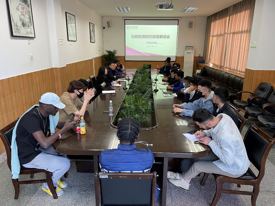 疫情就是命令,防控就是責(zé)任。為增強(qiáng)在校留學(xué)生的疫情防控意識(shí),強(qiáng)化校園疫情防控管理,解決當(dāng)前留學(xué)生群體面臨的各類問題,3月10日,國際教育學(xué)院召開當(dāng)前疫情防控政策解讀會(huì),副校長張東紅、國際教育學(xué)院副院長陳蕾、輔導(dǎo)員陸傳梓及全體在校留學(xué)生參加此次會(huì)議,會(huì)議由陳蕾主持。