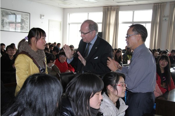 訪問團(tuán)成員,加拿大愛心教育慈善基金會(huì)、環(huán)球愛心教育基金會(huì)創(chuàng)辦人,教育家劉南生先生做了題為“教育強(qiáng)國的人生實(shí)踐”專題演講。他通過分享自己的成長經(jīng)歷,強(qiáng)調(diào)“人生離不開教育,教育改變?nèi)松钡恼胬怼L岢⒕锤改福P(guān)愛他人,奉獻(xiàn)愛心。訪問團(tuán)成員、加拿大前國會(huì)議員Mr.Bryon先生講述了15次中國行感受到的中國翻天覆地的變化, 激勵(lì)同學(xué)們打好知識(shí)基礎(chǔ)。 演講會(huì)氣氛熱烈,不斷博得同學(xué)們熱烈的掌聲。