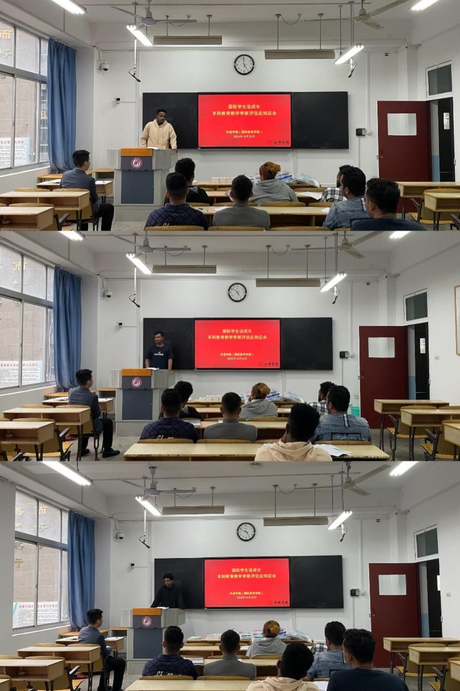 為加強(qiáng)來(lái)華留學(xué)生對(duì)我校本科教育教學(xué)審核評(píng)估工作的認(rèn)識(shí),促進(jìn)國(guó)際學(xué)生全面發(fā)展,10月24日下午4:00,國(guó)際教育學(xué)院在1209教室召開(kāi)了“國(guó)際學(xué)生說(shuō)成長(zhǎng)”暨本科教育教學(xué)審核評(píng)估應(yīng)知應(yīng)會(huì)主題班會(huì)。會(huì)議由留學(xué)生教育辦公室主任黃梓軒主持,外語(yǔ)學(xué)院教師孫衛(wèi)斌、留學(xué)生專(zhuān)職輔導(dǎo)員陸傳梓及全體留學(xué)生參加了此次會(huì)議。