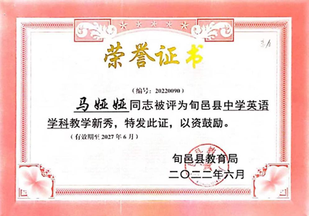 為加快推進我省新時代基礎(chǔ)教育“三級三類”骨干教師建設(shè),落實立德樹人根本任務(wù),2022年5月在旬邑縣教育局開展的教學能手選拔活動中,我校外語學院2018屆優(yōu)秀畢業(yè)生馬婭婭憑借扎實的教學基本功獲得“旬邑縣教學能手”榮譽稱號,這是她第二次獲得“教學能手”稱號。